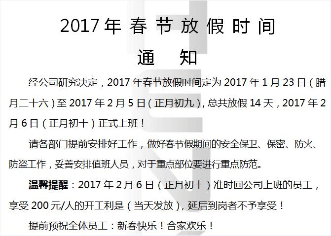 春節(jié)即將來臨,漢高機械決定在2017年1月23號開始放春假,有關(guān)各種業(yè)務(wù)的客戶請注意請注意請注意,為避免假期期間可能造成不必要的損失,請?zhí)崆鞍才藕霉ぷ鳎匾氖虑檎f三遍!