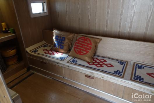 內(nèi)飾——運(yùn)用了蒙古傳統(tǒng)民族圖案及配色,選取當(dāng)?shù)爻S玫难蛎珰肿鳛椴牧?,極具地方特色風(fēng)情,而給志愿者們創(chuàng)造出了家的感覺。