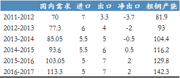 印度十二五計劃(2012年4月-2017年3月)末期,鋼材年需求將從本財年(截至2012年3月)的7000萬噸增加到1.133億噸,增幅超60%。如果GDP同比增幅保持在9%的話,印度國內(nèi)鋼材消費量將在“十二五”期間同比增長10.3%。截至2017年3月份,印度國內(nèi)粗鋼年產(chǎn)能將增加到1.423億噸,當(dāng)前年產(chǎn)能為8190萬噸。2016-2017財年,印度成品材進(jìn)口量將小幅提升至500萬噸,出口量將實現(xiàn)翻番至700萬噸。同時,印度將于2014-2015財年實現(xiàn)鋼材凈出口,而受印度煉鋼產(chǎn)能的限制,過剩產(chǎn)能有限,因此成品材難實現(xiàn)大批量出口。如果擴(kuò)產(chǎn)項目能夠如期進(jìn)行,印度產(chǎn)量將能夠正好滿足國內(nèi)需求,但擴(kuò)產(chǎn)項目一旦推遲進(jìn)行,供需情況將趨緊。